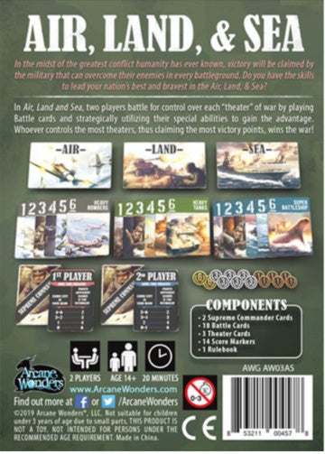 In Air, Land and Sea, two players battle for control over each “theater” of war by playing Battle cards and strategically utilizing their special abilities to gain the advantage. Whoever controls the most theaters, thus claiming the most victory points, winds the war!